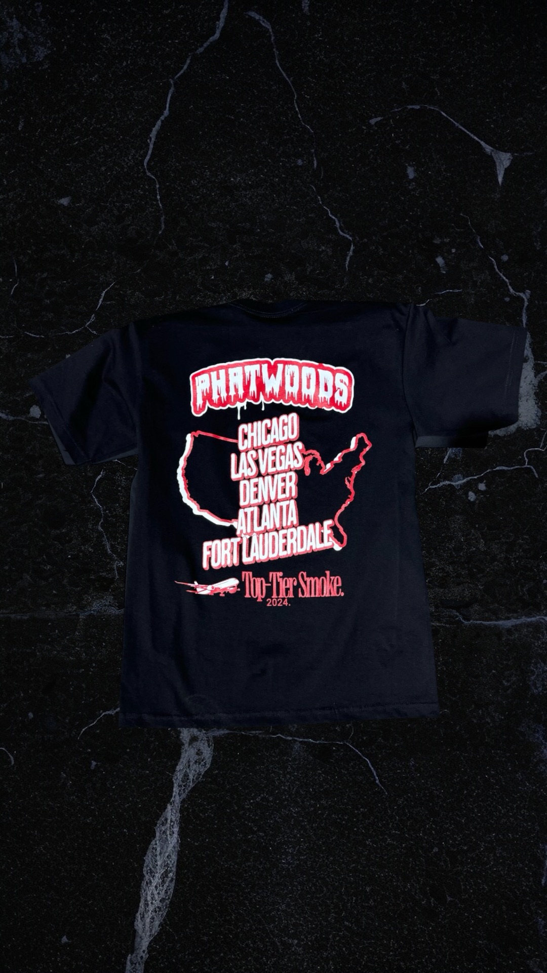 Official Phatwoods heavyweight tee. Premium cotton with clean screen print logo. Relaxed fit. Front logo, back city tour print — Chicago, Las Vegas, Miami, Atlanta, Fort Lauderdale.